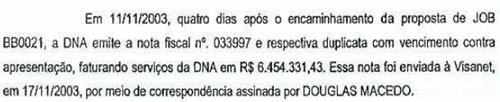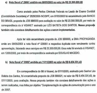 “O primeiro grande depósito do Fundo Visanet na conta da DNA, no valor de R$ 23,3 milhões, feito em 08 de maio de 2003, traz as assinaturas de Léo Batista dos Santos e Douglas Macedo. Em novembro do mesmo ano, outro grande depósito, desta vez de R$ 6,4 milhões, traz a assinatura de Douglas Macedo. Nada de Pizzolato.”