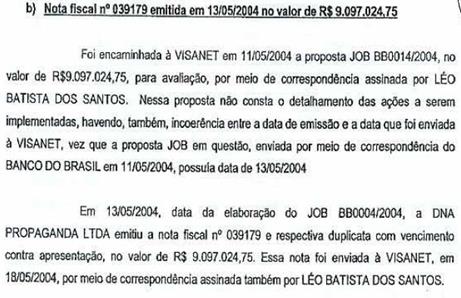 Na parte 2 do Inquérito 2474, páginas 89 e 90, o delegado federal Luiz Zampronha destrincha os repasses de recursos que a Visanet disponibilizava ao Banco do Brasil para gastos publicitários com a DNA no ano de 2004. Sobre o ano de 2003, já falamos em post anterior.  Foram duas notas fiscais emitidas em 2004, a […]