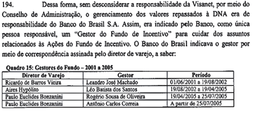 Zampronha novamente dá o nome do servidor responsável pelos repasses à DNA: Léo Batista dos Santos. Ele era o responsável pela gestão do Fundo Visanet junto ao Banco do Brasil, conforme a orientação do Regulamento Visanet e de portarias aprovadas no BB.