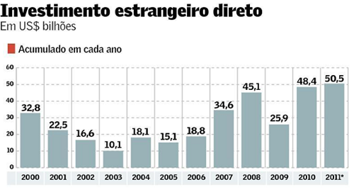 Com isso, o volume de investimento estrangeiro no Brasil nos últimos 4 anos deverá terminar, usando a estimativa mais pessimista para 2014, em US$ 253,6 bilhões. Esse número corresponderá a um aumento de 254% sobre o IED nos quatro primeiros anos do governo Lula, e de 62% sobre os quatro anos da gestão seguinte.