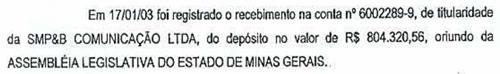 Continuando a ler a parte 5 do inquérito 2474, encontro algumas possíveis explicações para tanto sigilo. Na página 193, Zampronha informa que descobriu, em 2003, um depósito superior a R$ 800 mil da Assembléia Legislativa do Estado de Minas Gerais numa das contas de Valério:
