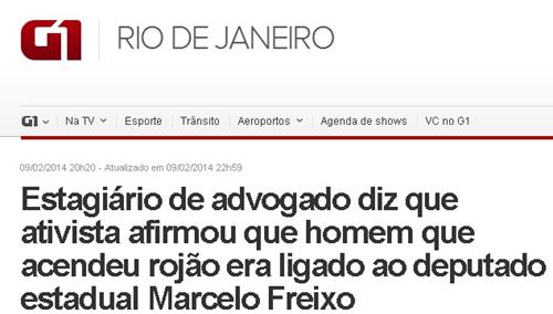 não sei porque pisei na bola. deixei bem claro que acho que freixo não tem ligação com o rojão, apesar de que a mãe do fabio raposo disse que acha que ele tem, sim, ligação com marcelo freixo. nem falei isso. até porque, mesmo que raposo tivesse alguma ligação, não acho que freixo pode ser responsabilizado diretamente. no máximo, por dar corda a essa onda de violências em manifestações, como se isso fosse uma brincadeira “jovem”.