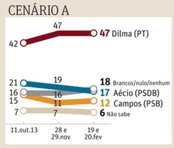 No cenário 1, com Aécio e Campos, o tucano continua esvaziando: tinha 21 pontos em outubro, caiu para 19 em novembro e agora tem 17. Campos ganhou um pontinho em relação à novembro, e ficou em 12%, mas permanece abaixo da pontuação que tinha em outubro, quando chegou a 15%