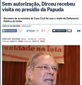 O título da matéria dá a entender que Dirceu tem qualquer culpa pela visita de 20 minutos que recebeu de um defensor público do DF, em janeiro deste ano.