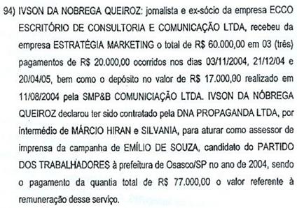Os itens acima reforçam a teoria do caixa 2. Repare que os recursos repassados para Valério para o município de Osasco são, indiscutivelmente, para gastos de campanha. João Paulo Cunha, deputado federal pelo PT, com base em Osasco, sempre alegou que o dinheiro que recebera do esquema Valério/Delúbio, nessa mesma época, era para pagar uma despesa de campanha. Com esses outros exemplos, agora vemos que o valerioduto estava mesmo investindo em campanhas petistas em Osasco e outras cidades, confirmando versão de Cunha, mais um que se pode considerar um preso político.