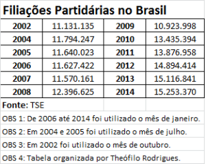 Cabe ressaltar que esse crescimento não é apenas nos valores absolutos. O crescimento também é relativo se compararmos com o eleitorado de cada período. Em 2002 aproximadamente 9% do eleitorado brasileiro estava filiado em algum partido. Em 2014 esse número subiu para cerca de 11%.