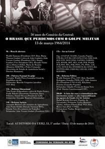 A Comissão da Verdade do Rio convida todas e todos para o seminário “50 anos do Comício da Central: O Brasil que perdemos com o Golpe Militar”, promovido em parceria com o Instituto João Goulart.