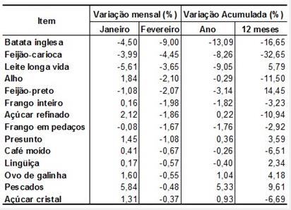A inflação do item Alimentos e Bebidas caiu de 0,84% em janeiro para 0,56% em fevereiro.