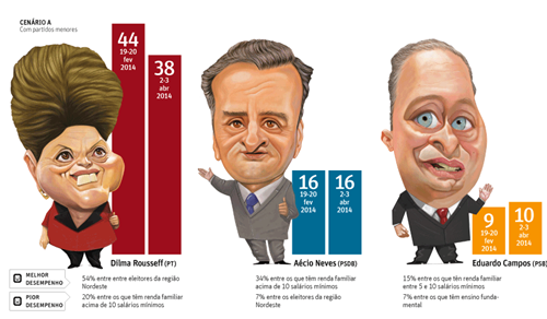 Segundo o cenário do Datafolha, as intenções de Dilma caíram de 44% para 38%. Aécio se manteve em 16%. Campos cresceu para 10%. Entretanto, a presidenta ainda leva no primeiro turno em todos os cenários, com exceção naquele com presença de Marina.