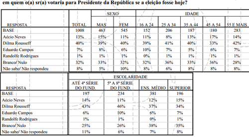 Dilma lidera com 40% no estado do Rio, contra 13% de Aécio e 7% de Campos. A petista tem mais força na periferia (44%), onde, curiosamente, o número de votos nulos e brancos é bem menor do que na capital. No interior os votos em branco são ainda menores, e a oposição tem aí a sua melhor pontuação: Aécio tem 17%, Campos 12%.