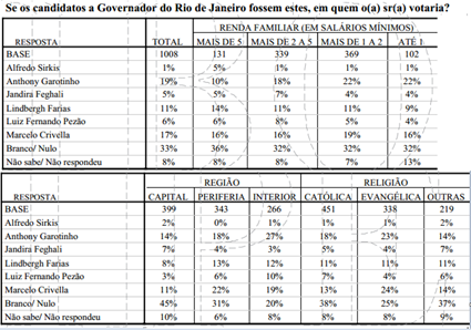 Na pesquisa de intenção de voto no Rio, o que me chama atenção é a força política de Garotinho. Depois de sair do governo e do PMDB praticamente escorraçado pela mídia, Garotinho lidera as pesquisas com 19% das intenções de voto; entre aqueles com até quarta-série, Garotinho tem 26%.