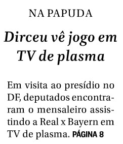 BRASÍLIA – Deputados da Comissão de Direitos Humanos que visitaram o presídio da Papuda nesta terça-feira, em Brasília, encontraram o ex-ministro José Dirceu assistindo ao jogo de futebol entre Real Madrid e Bayern, em uma televisão de plasma. O condenado a sete anos e 11 meses de prisão em regime semiaberto por participar do mensalão está sozinho em uma cela de 23 m², com micro-ondas, fogareiro e chuveiro com água quente.