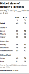 A Pew também pesquisa a opinião dos brasileiros sobre os “protestos”. Os pobres e menos escolarizados desaprovam, os ricos e escolarizados aprovam, o que revela uma certa compreensão crescente da sociedade sobre o sentido político-partidário de algumas manifestações. Há também uma clivagem geracional forte: a juventude (18-29) tende a apoiar os protestos (52%), enquanto a maioria dos mais velhos (mais de 50) os vêem como uma coisa negativa. O campo desaprova protestos, as áreas urbanas apóiam. De qualquer forma, há uma divisão bastante equilibrada entre aprovação e desaprovação em todos os campos. Não há maioria substancial de apoio ou rejeição a manifestações em lugar nenhum. Um dado curioso é que a maioria das mulheres (51%) desaprovam os protestos, enquanto a maioria dos homens aprovam (também 51%). Este “conservadorismo” feminino (que aqui não deve ser interpretado no mau sentido), que eu sempre notei nas pesquisas, constitui um fator bastante favorável à Dilma, que tem uma imagem conservadora, de mulher séria e honesta. E é mulher.