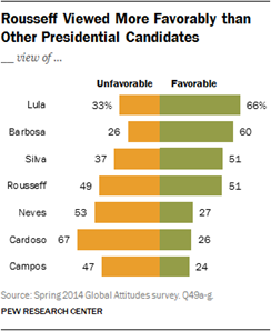 Esse gráfico traz notícias positivas para a presidente. Seus principais opositores, Aécio Neves e Eduardo Campos, são vistos menos favoravelmente que ela. FHC, principal cabo eleitoral de Aécio, é visto desfavoravelmente por 67% dos brasileiros. Lula, por sua vez, é visto favoravelmente por 66% dos entrevistados. O “Silva” é Marina Silva, ela segue empatada com Dilma no índice de “favorável” (51%), mas tem menor rejeição (37%) que a presidente (49%). Só que Marina não é candidata a presidente, mas a vice de Campos.
