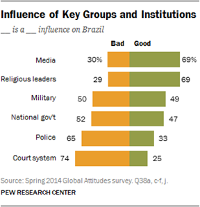 Estes números apenas aparentemente são bons para a mídia. Segundo a Pew, em 2010, 81% dos entrevistados tinham a mídia como uma “boa influência” para o Brasil. Hoje esse número caiu para 69%. Os brasileiros estão mais céticos e mais desconfiados, o que é um sinal de avanço democrático. Em democracias avançadas, a mídia é vista com forte desconfiança. Interessante notar que a instituição com pior avaliação é o sistema judiciário.