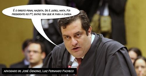 Já o advogado de Genoíno, Luiz Fernando Pacheco, nunca esteve embriagado. Ele está, isso sim, tomado de profunda indignação, porque se tratava, naquele momento, de defender não apenas os direitos de seu cliente, mas a própria vida de Genoíno, além da vida de sua família, que também vive um pesadelo.