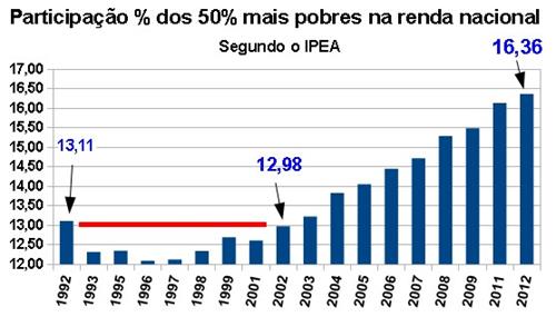 Observe que, em 1992, os 50% mais pobres detinham 13,11% da renda nacional; ao fim de 2002, sua participação diminuíra para 12,98%. Ao final de 2012, atingiu o recorde de 16,36%.