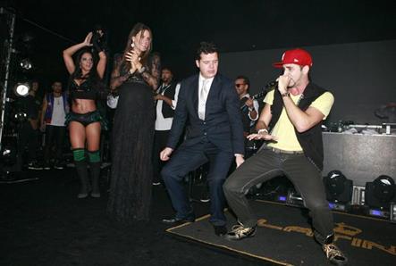 Saulo Wanderley Filho, presidente da Cowan, dança com Latino, em sua festa de aniversário.