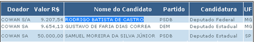 A empresa ganhadora, Cowan, tem relações íntimas com os tucanos mineiros. Para começar, as únicas doações que ela fez para políticos, e não para diretórios, foram para tucanos e democratas. Em Minas, ela escolheu a dedo a quem doar: Rodrigo Batista de Castro, deputado federal pelo PSDB, e filho do poderoso Danilo de Castro, secretário de Estado do governo de Minas Gerais. O quadro abaixo é do TSE, com dados da eleição de 2010.
