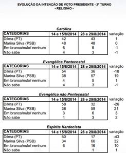 Na segmentação por religião, para o segundo turno, vemos dados que explicam perfeitamente o pragmatismo eleitoral de Marina ao recuar das propostas de política gay. Observe que Dilma não caiu entre os católicos; ao contrário, até oscilou positivamente um ponto. Sua queda entre uma pesquisa e outra se concentrou entre os evangélicos e kardecistas.
