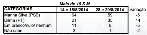 Curiosamente, Dilma repete no segundo turno uma performance que já detectamos nos votos espontâneos no primeiro: ela cresceu fortemente entre as classes mais ricas, embora ainda se mantenha bastante atrás de Marina Silva. No segmento com renda acima de 10 salários, a vantagem de Marina, que era de 43 pontos no dia 15 de agosto, passou para 23 pontos no dia 29 do mesmo mês.