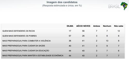 Observe ainda que Aécio é visto como o candidato que “defenderá os ricos” pela maioria, enquanto Dilma está consolidada como a que “defenderá os pobres”.
