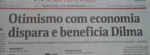 “Pesquisa Datafolha realizada nesta terça-feira (21) indica otimismo dos eleitores em relação à economia, o que ajuda a explicar a reação da presidenta Dilma (PT) na corrida pela reeleição”. É assim que começa a principal notícia da capa da Folha de São Paulo desta quarta-feira, 22.
