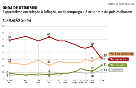 Para 44% da população a situação econômica do país vai melhorar, um incrível salto de 12 pontos em relação a última pesquisa, feita nos dias 25 e 26 de setembro. E mais: apenas 15% pensa que a situação vai piorar, uma queda de 10 pontos, como pode ser observado no gráfico abaixo.