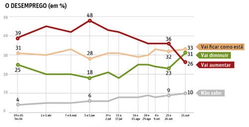 O sentimento em relação ao desemprego, visto no gráfico abaixo, também foi positivo para a presidenta Dilma. Somente para 26% da população o desemprego vai aumentar, uma queda de 10 pontos, enquanto 31% acredita que vai diminuir, um crescimento de 8 pontos.