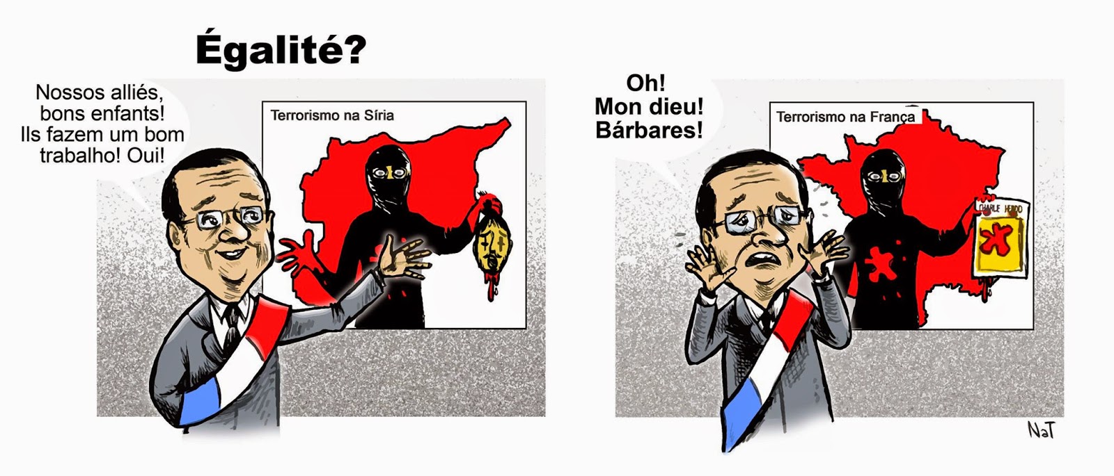Vi uma charge que eles desenharam um arabe de 4 com os testículos pendurados e uma estrela de davy em cima do cu . Me deu nojo. o Cara que fez isto tinha certeza que não ia ser punido por tamanha ofensa a um povo. Ninguem tem o direito de ofender desta maneira ,como também minguem tem o direito de tirar uma ou mais vidas para cobrar uma putaria desta com nome de arte