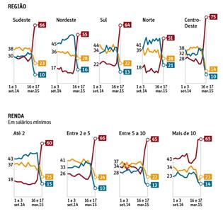 A aprovação de Dilma e do governo, como era de se esperar, despencou. Em todas as regiões e em todas as faixas de renda, incluindo Nordeste e mais pobres.