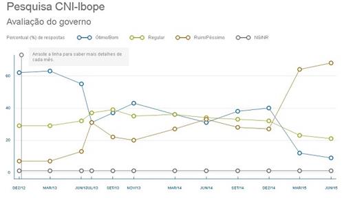 A popularidade do governo Dilma Rousseff recuou ainda mais em junho. O número de brasileiros que considera o governo ótimo ou bom caiu de 12% em março para 9% em junho. O percentual da população que avalia o governo como ruim ou péssimo subiu de 64% em março para 68% em junho, mostra a pesquisa CNI-Ibope, divulgada nesta quarta-feira, 1º de julho, pela Confederação Nacional da Indústria (CNI). O levantamento informa ainda que 83% desaprovam a maneira de governar da presidente e 78% não confiam em Dilma Rousseff.