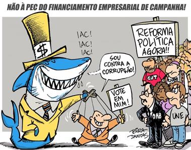 Odenir Batista, os que não deverão ser esquecidos, são os 103 que não votaram. Estes sim sujaram fora do pinico. Porque o financiamento de campanhas deveria sim, continuar a ser feito pelas Empresas que quisessem contribuir. Desde que fosse feito tudo com a maior lisura, e transparência possíveis. Assim que as Empresas fizessem as doações, já teriam que enviar comunicado ao STE, com cópia para a imprensa. E o partido beneficiado teria que encaminhar documento ao STE confirmando o recebimento, com cópia para a imprensa. Porque senão quem terá que financiar estas campanhas, seremos nos, os otários de sempre. Procure saber quanto era a verba que cada partido recebia antes de se começar a falar em acabar com o financiamento de campanhas pelas Empresas doadoras, e o quanto é hoje. Já se precavendo sobre o que poderia acontecer, eles já se movimentaram em busca de mais verba. Veja esta manchete de jornal: “21/04/2015 08h42 – Atualizado em 21/04/2015 14h17
