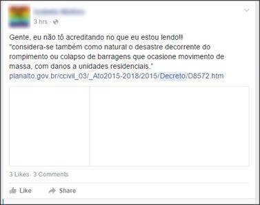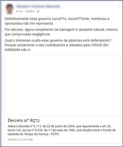 Algumas pessoas estão compartilhando posts revoltados sobre o Decreto nº8.572/2015 nas redes sociais. Segundo tais pessoas, o mencionado decreto determina que rompimento de barragem agora é desastre natural, excluindo responsabilidade dos envolvidos.