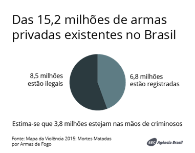 Segundo o Mapa da Violência 2015, do total de armas no Brasil, 6,8 milhões estão registradas e 8,5 milhões estão ilegais, com pelo menos 3,8 milhões nas mãos de criminosos.