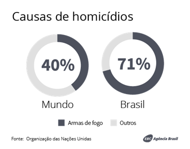 Já no estudo Mapa das Armas de Fogo nas Microrregiões Brasileiras, o pesquisador do Instituto de Pesquisa Econômica Aplicada (Ipea) Daniel Cerqueira concluiu que o aumento de 1% na quantidade de armas de fogo em circulação eleva em até 2% a taxa de homicídios. Dados da Organização das Nações Unidas mostram que, enquanto no mundo as armas de fogo estão associadas a 40% dos homicídios, no Brasil, os disparos são responsáveis por 71% dos casos.