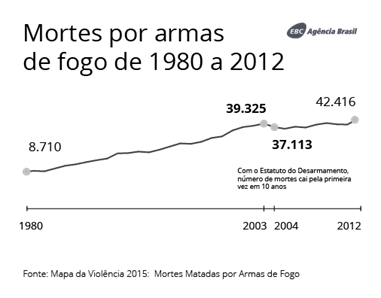 Mais de 880 mil pessoas morreram no Brasil vítimas de armas de fogo (homicídios, suicídios e acidentes) de 1980 a 2012, segundo o Mapa da Violência 2015. No último ano do levantamento, 42.416 pessoas morreram por disparo no país, o equivalente a 116 óbitos por dia.
