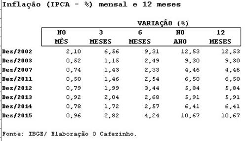 A principal diferença de 2002 para hoje é que, ao final daquele ano, a inflação vinha num crescendo, tanto é que, no mês de dezembro, havia ficado em 2,10%, mais que o dobro da inflação registrada em dezembro de 2015. No acumulado de 3 meses até dezembro de 2002, a inflação estava em 6,56%; nos três meses encerrados em dezembro de 2015 ficou em 2,82%.