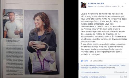 A revista Veja acabou não checando as informações e publicou a foto errada. Em postagem em seu Facebook, a jornalista que aparece na revista, Maria Paula Letti diz: ”Ter minha imagem vinculada ao maior escândalo de corrupção da história do Brasil não só me assustou como me deixou furiosa! É simplesmente um absurdo. Já estou tomando as devidas medidas judiciais cabíveis”. Ela ainda afirma estar entristecida pelo fato de também ser jornalista e ver que não houve uma checagem na hora da publicação em uma das maiores revistas do país. Confira a publicação: