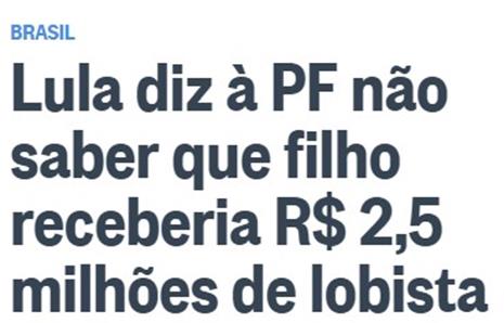 Repare que a manchete já é uma condenação em si. Primeiro porque tenta associar à Lula a imagem do presidente que “não sabia” de nada. Segundo porque diz que filho de Lula “recebeu” R$ 2,5 milhões, ou seja, ele não trabalhou, não assinou um contrato, ele “recebeu”. Terceiro que o pagador é chamado não de empresário, mas somente de “lobista”, um nome coringa que se usa sempre que se quer criminalizar alguém.