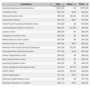 Enquanto isso a campanha de Bernie Sanders não aceita doações de empresas. Desde sua primeira eleição para deputado no estado de Vermont, até os dias de hoje, seu financiamento vem majoritariamente de sindicatos e de contribuições pela internet.