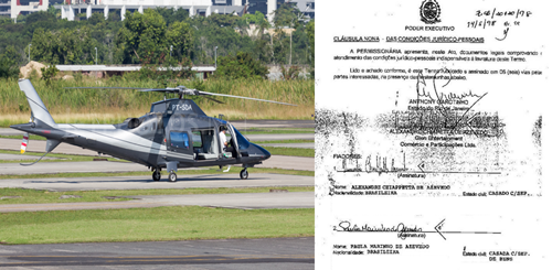 Abaixo, o helicóptero no aeroporto Roberto Marinho, em Jacarepaguá, no Rio e a assinatura da neta do magnata como fiadora de concessão obtida sem concorrência pública: