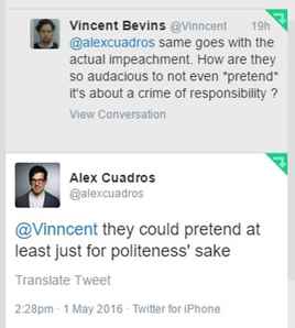 No twitter, dois importantes correspondentes internacionais, Vincent Bevins, do Los Angeles Times e Alex Cuadros, da Bloomberg, trocaram hoje comentários sarcásticos sobre o golpe.