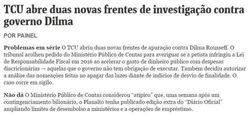 O TCU, por sua vez, involucrado no golpe desde o início, já que o processo de impeachment é baseado no show midiático proporcionado por uma votação no plenário da instituição no ano passado, volta ao ataque, tentando criminalizar cada mínimo ato administrativo da presidenta.