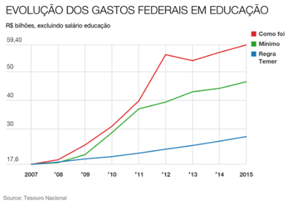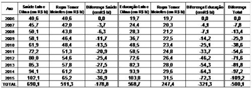 Fica claro que o governo interino golpista não se preocupa com Educação e Saúde, e por isso quer limitar os investimentos nessas áreas com essa regra absurda, que poderá afetar toda uma geração de brasileiros/as.