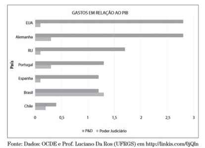 Afinal, se o interesse que atuou como motor de todo o processo foi permitir à elite do dinheiro se apropriar da riqueza coletiva sem peias, outros sócios menores se associaram à aventura: a grande mídia, por razões que ficarão claras na segunda parte deste livro, e o complexo jurídico-policial do Estado. A “casta jurídica” também assalta o país com salários nababescos e vantagens de todo tipo que o mortal comum sequer sonha. A relação entre o gasto da máquina judiciária e o PIB nacional no Brasil é singular no mundo, como mostra a tabela abaixo.