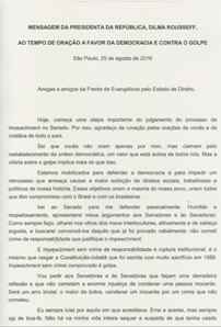Mais do que isso, a presidenta escreveu no documento que “levarei comigo as orações e os votos de vocês no Senado, quando defenderei a democracia”.