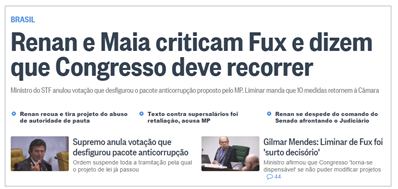 Matéria muito técnica, de difícil compreensão ao público geral. A correspondente em Brasília exibiu reportagem sobre discussão do assunto no Senado. O que ficou decidido por Renan, depois de pressionado por outros senadores, é que a votação das 10 medidas acontecerá ano que vem. Parece que há resquícios da queda de braço entre STF e Renan.