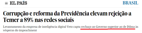 Uma pesquisa citada pela versão em português do jornal El País, um dos principais da Europa, revela que a rejeição de Michel Temer nas redes sociais já é superior a de Dilma às vésperas do impeachment.