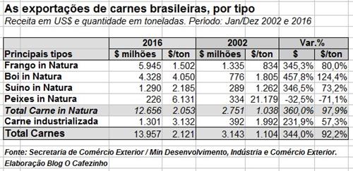 Observe, na tabela 2, que as exportações brasileiras de carnes cresceram fortemente desde 2002: mais de 344%.